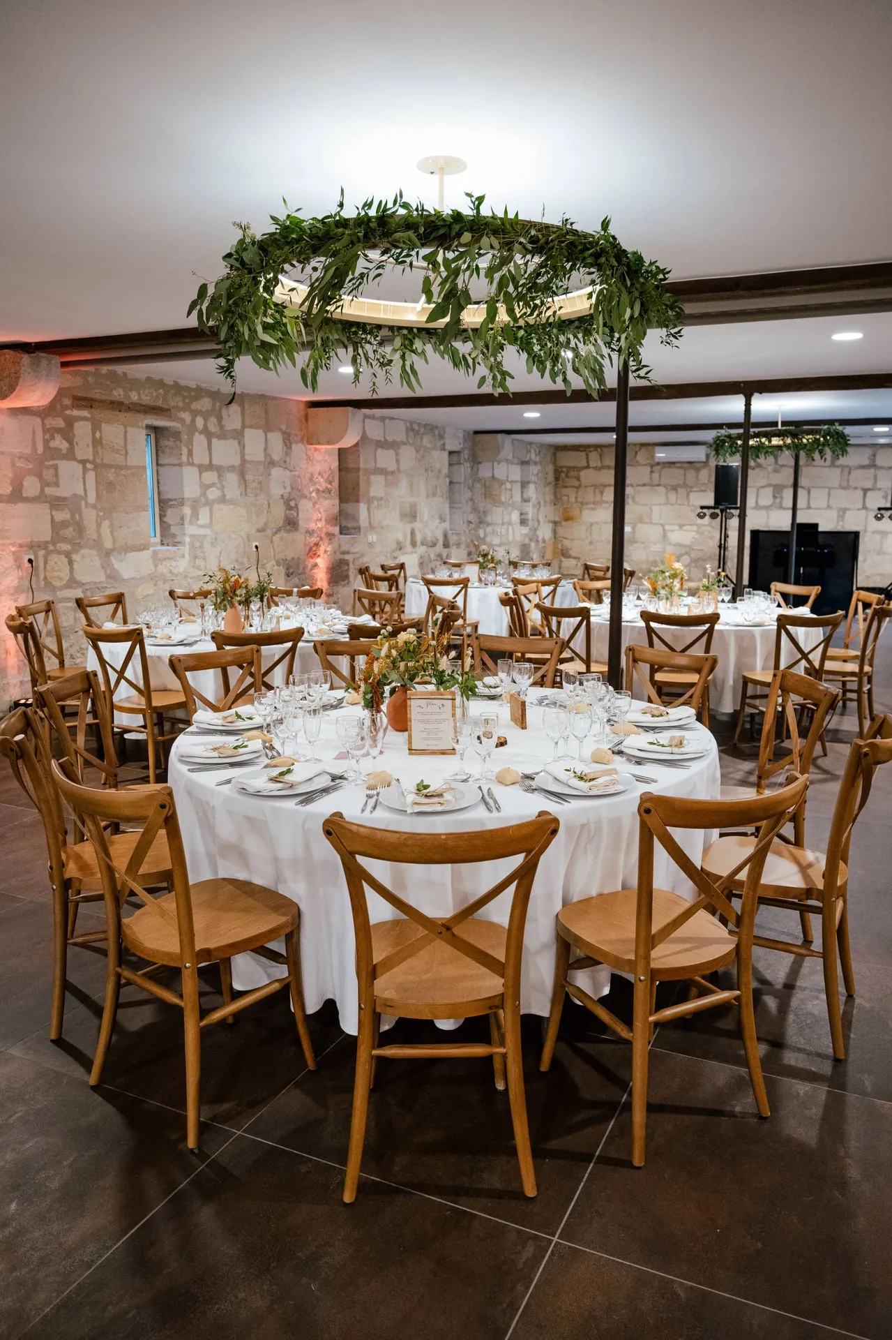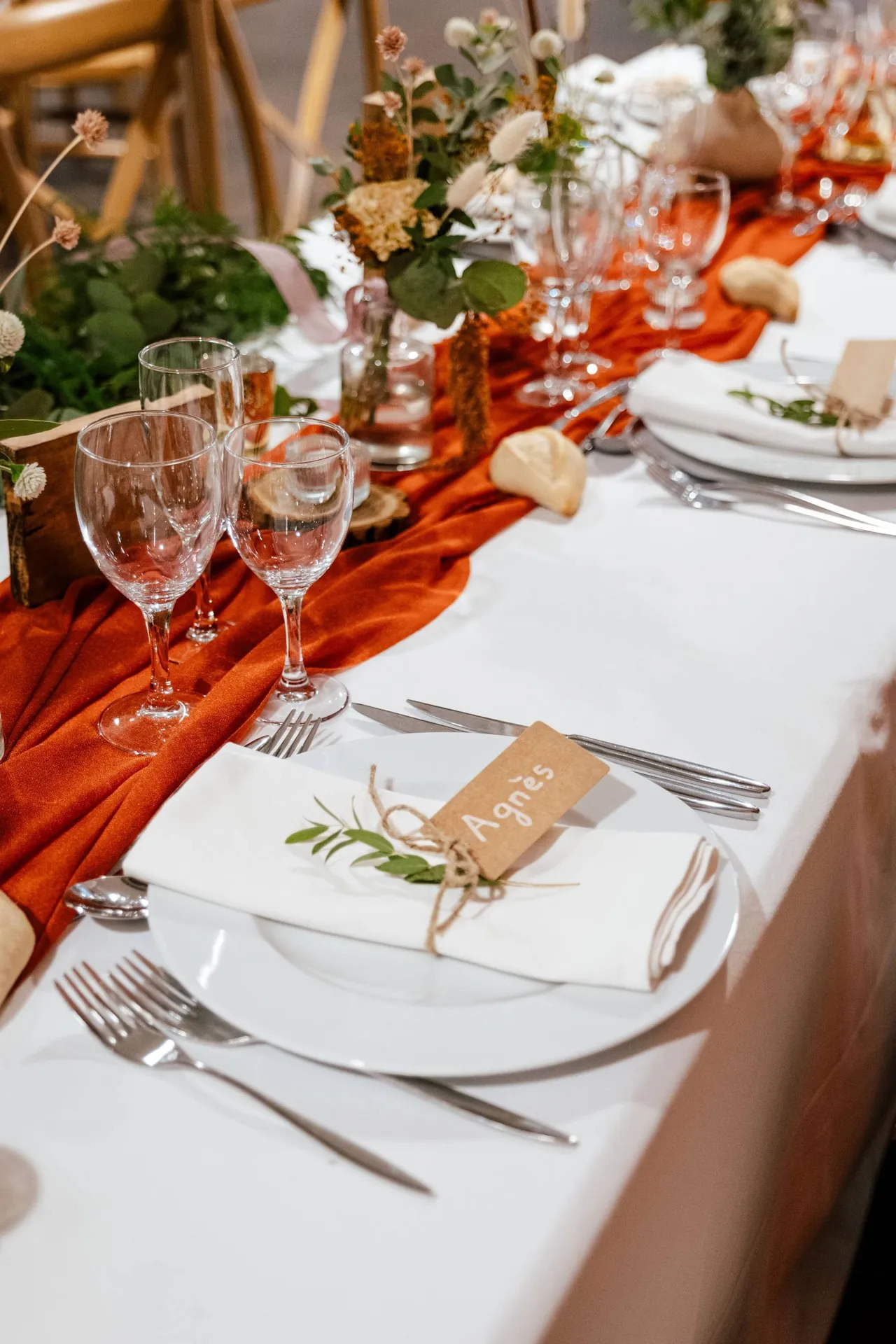 La décoration, bohème, a enveloppé chaque recoin du Château Couffins dans des tons orangés et naturels. Des couleurs vibrantes qui ont capturé la chaleur et la vitalité de l'amour de Karine et Agnès. Des suspensions fleuries délicates suspendues au-dessus des tables ont créé une atmosphère féerique, tandis que la piste de danse était ornée de joyeuses cascades florales, invitant les invités à se perdre dans la magie de la danse et de la célébration.