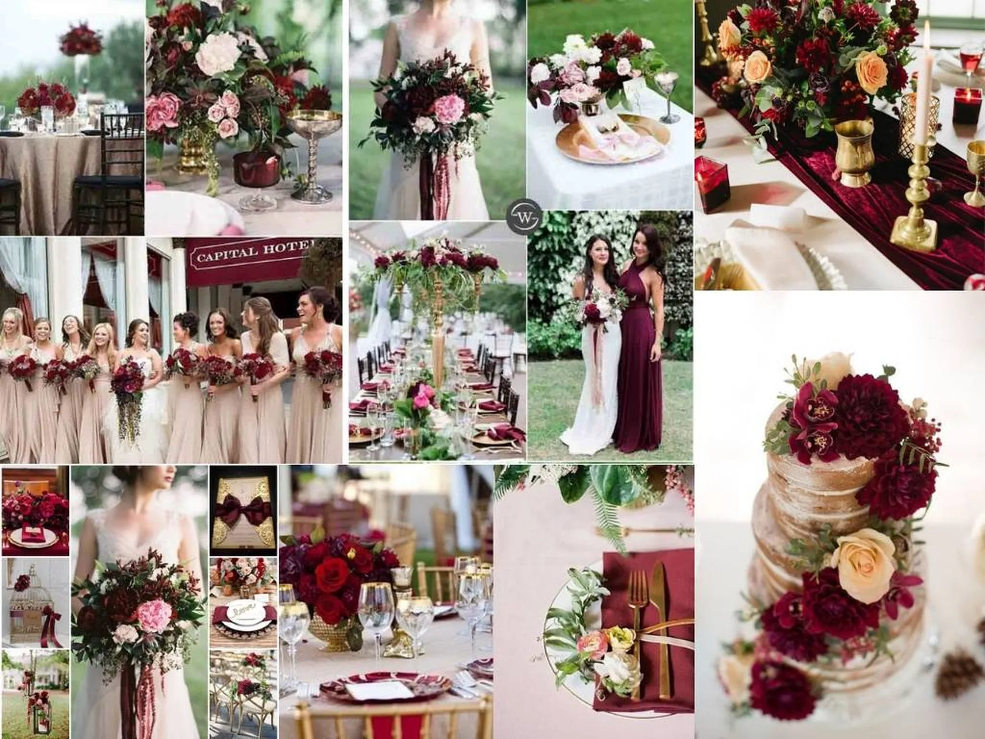 Une cage à oiseaux or avec des fleurs bordeaux pour votre urne ? Ou encore des lanternes fleuries pour votre vin d’honneur et des faire-part bordeaux et or ?